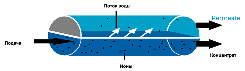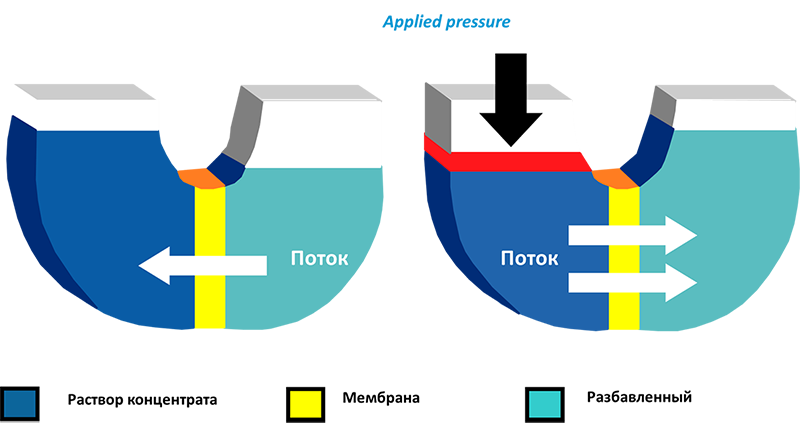 ОБРАТНЫЙ ОСМОС – это название явления, при котором жидкость проходит через полупроницаемую мембрану под воздействием механического давления на жидкость, которое выше, чем осмотическое давление, при этом растворенные соединения остаются на мембране.