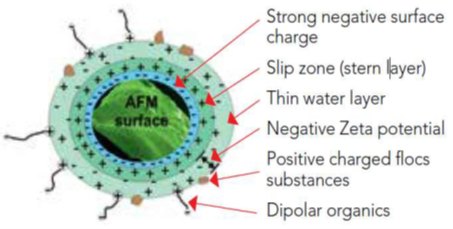 В настоящее время для фильтрации загрязненной воды используются в основном обычные песочные фильтры. Однако песочные фильтры создают питательную среду для бактерий, вызывая образование биопленок. Биопленка состоит из слоя микроорганизмов, вырабатывающих слизь, с помощью которой они прикрепляются к такой поверхности, как фильтр. Предотвратить размножение бактерий на песке невозможно, так как это отличный субстрат. Даже если песочный фильтр постоянно промывать, на песке образуется очень эффективная биопленка. Со временем бактерии образуют устойчивые каналы через песочный фильтр. Поскольку через эти каналы протекает загрязненная техническая вода, она не фильтруется, что приводит к ухудшению качества воды. AFM — это революционный фильтрующий материал из зеленого стекла, который образует полупористую структуру (поры диаметром от 2 до 50 нм) для увеличения площади поверхности фильтра. Типичный песочный фильтр имеет площадь поверхности 3000 м2 на кубический метр воды, тогда как площадь поверхности AFM превышает 1 000 000 м2 на кубический метр воды. Это увеличение площади поверхности более чем в 300 раз, а значит, вода фильтруется лучше и быстрее. Поскольку стекло имеет отрицательно заряженные гидроксильные группы на поверхности, это придает AFM сильный отрицательный заряд, также называемый дзета-потенциалом (см. Рисунок). Дзета-потенциал гарантирует, что нерастворимые частицы, такие как (тяжелые) металлы и органические молекулы, связываются со стеклом. Кроме того, отрицательный заряд предотвращает колонизацию бактерий на фильтре, поэтому бактерии на фильтре не размножаются. Время от времени AFM также необходимо промывать, чтобы удалять связанные вещества. Однако, поскольку связанные вещества удерживаются за счет относительно слабой электронной связи, они легко промываются с использованием гораздо меньшего количества воды по сравнению с песочным фильтром. Большим преимуществом является то, что фильтрующий материал AFM не требует замены, в отличие от песочного фильтрующего материала.
